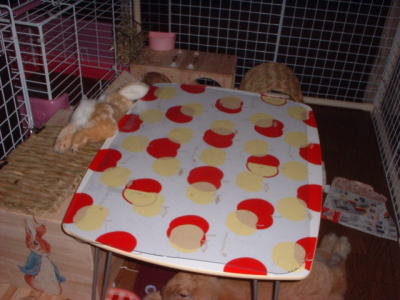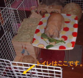 現在は、みかんの食べる量が増え、テーブルで食べています。写真はコチラ。(この写真でみかんが食べているのは、小松菜ではなく生牧草です。ニラでもありません。ニラはうさぎにはキツイようなので与えないで下さい。) |