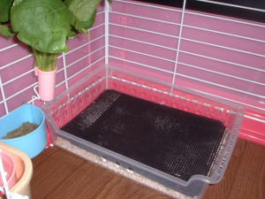 ケージの中にもジョイントマットを敷いた上に、床と同じフロアーマットを敷き、トイレをお手製の四角いものに変更しました。 |