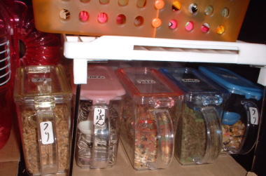 | みんなの主食をそれぞれストックしてあります。それぞれの子の好みや必要栄養に合わせてブレンドしてあります。似たようなものを食べているようでも、やっぱりちょっとずつ違うので、それぞれ別のエサを買ってブレンドしています。でも似ているので間違え易いんです。 |