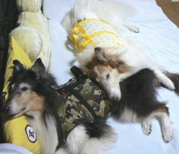 | 「今まで、沢山の楽しい思いをさせて貰ったので、最後までお世話させて頂く!」それが飼主であるわん!さんの想いです。足腰の弱ったシニアさん達が自力で起きれない時に起こしてあげたり、ふら付いている時には、すぐに支えてあげられるように背中に持ち手のついている介護ベストを作って着せて貰ってます。 |
