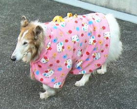 老犬になると体温調節ができなくなるので、コリーといえども寒さに弱くなるということで、お外に出る時には、その上からポンチョを羽織って貰って出ます。