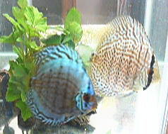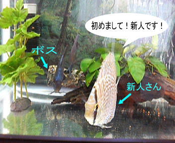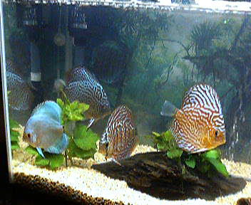 我家のディスカス四匹衆。まだまだ幼魚なので、雌雄の判明は不能です。飼育が難しいと聞いていたディスカスですが、手探り状態の素人飼育でも元気で頑張ってくれています。 |